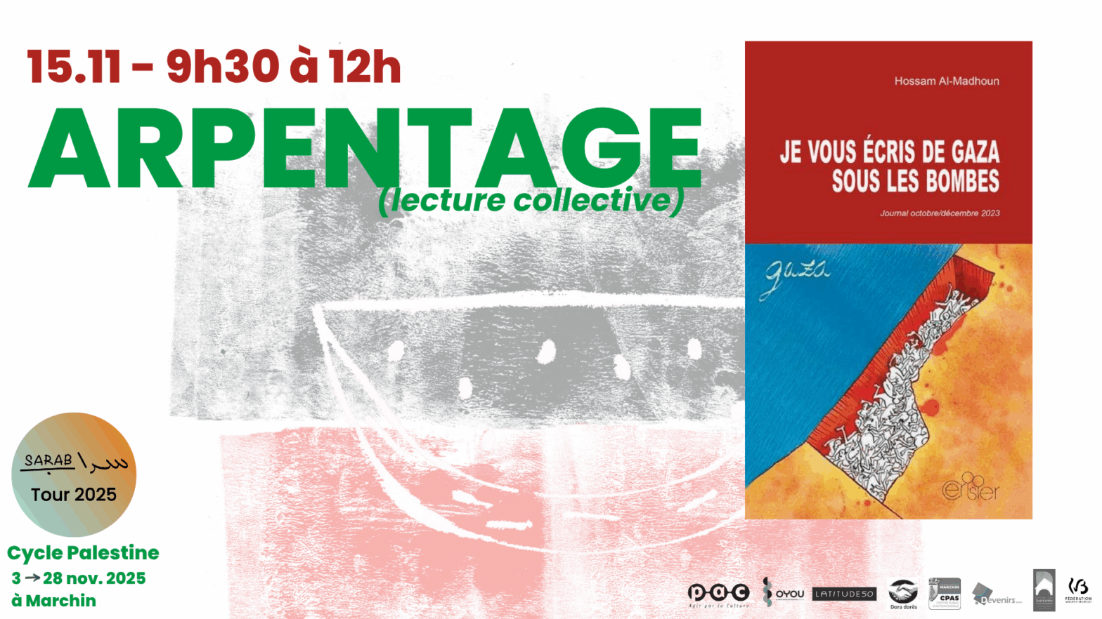 Du 15 au 28 novembre 2025, plusieurs acteurs associatifs, culturels et sociaux de Marchin s’unissent pour proposer un cycle d’activités autour de la Palestine. Dans un contexte de violences structurelles… Continue reading Cycle Palestine